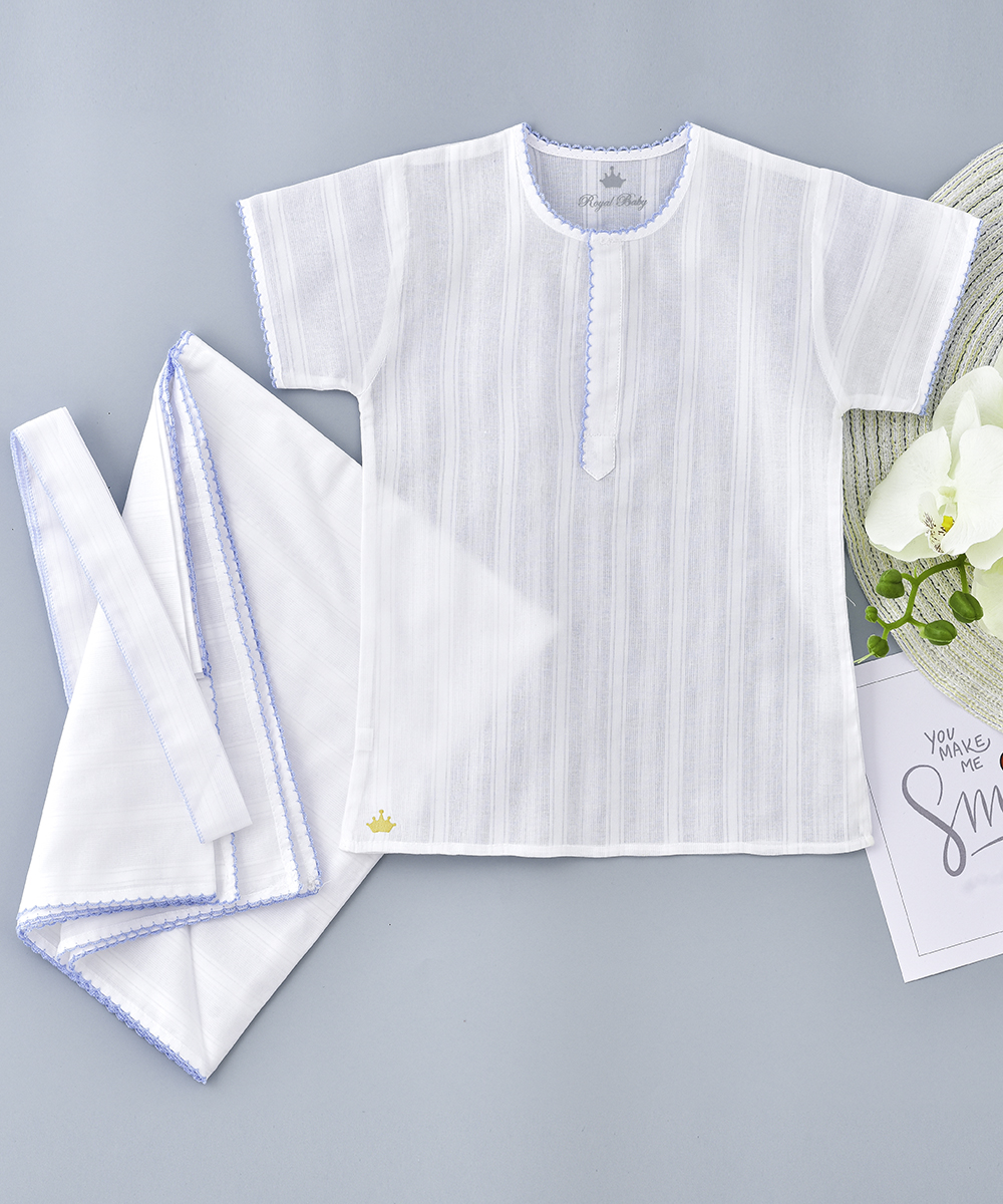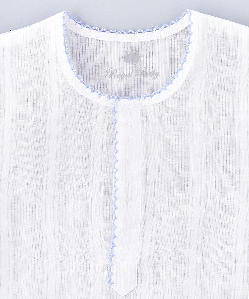 ROYAL BABY’S 3 piece jalabiya wrapper and belt.Are made up of 100 % cotton soft and thin cloth, breathable versatile and pre washed cloth. Finished with beautiful pikku design . made by 100% swiss cotton fabric .Ensures baby’s ultimate comfort at bed time and beyond.