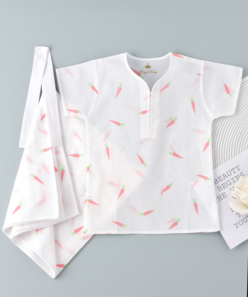 ROYAL BABY ‘ S 3 piece jalabiya wrapper and belt are made up of 100 % cambric printed cotton soft and thin cloth breathable versatile and pre washed cloth. Printed with beautiful carrot design. Ensures baby’s ultimate comfort at bed time and beyond