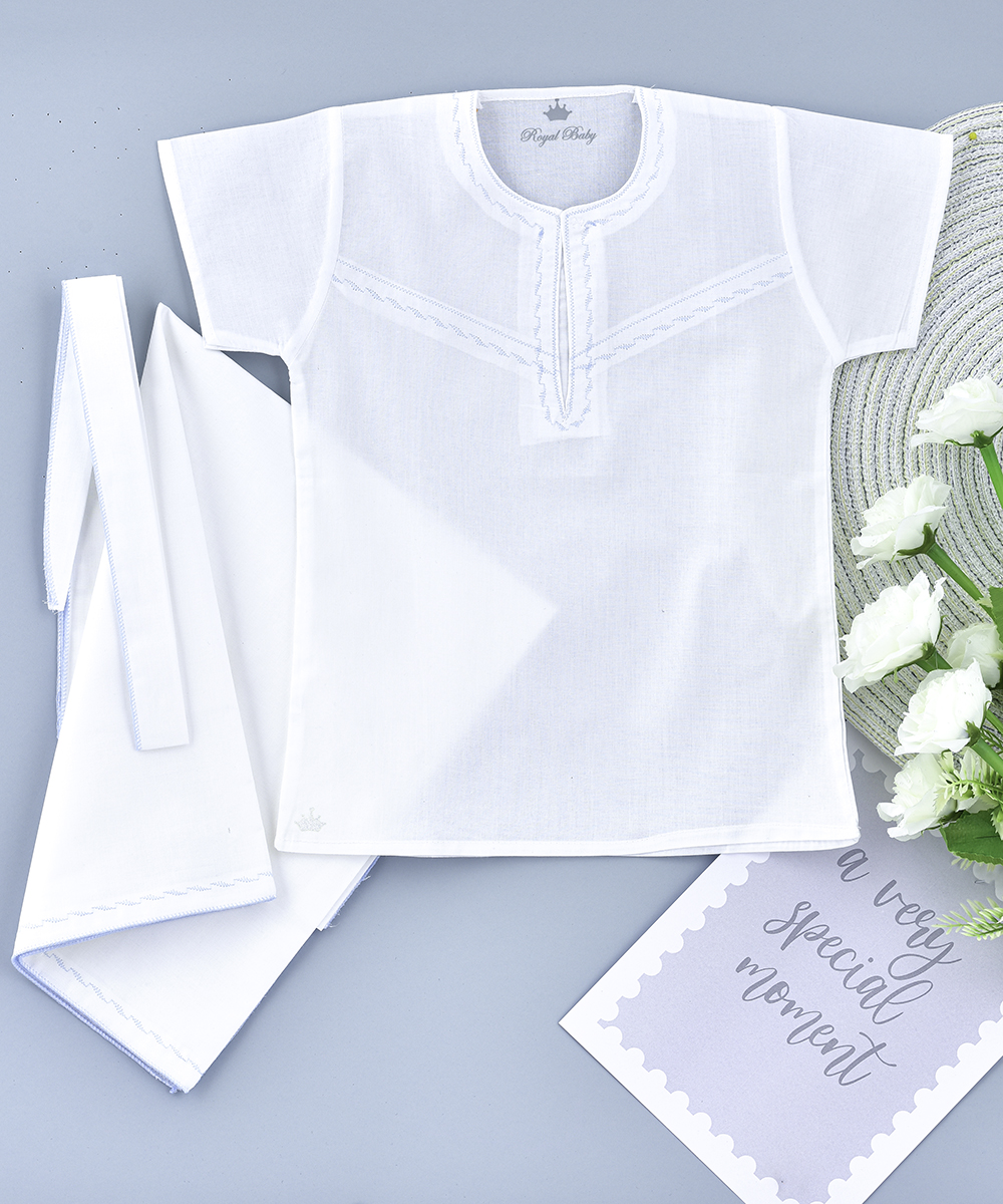 ROYAL BABY’S 3 piece jalabiya wrapper and belt.Are made up of 100 % cambric cotton soft and thin fabric, breathable versatile and pre washed cloth. Finished with beautiful embroidery design .Ensures baby’s ultimate comfort at bed time and beyond.