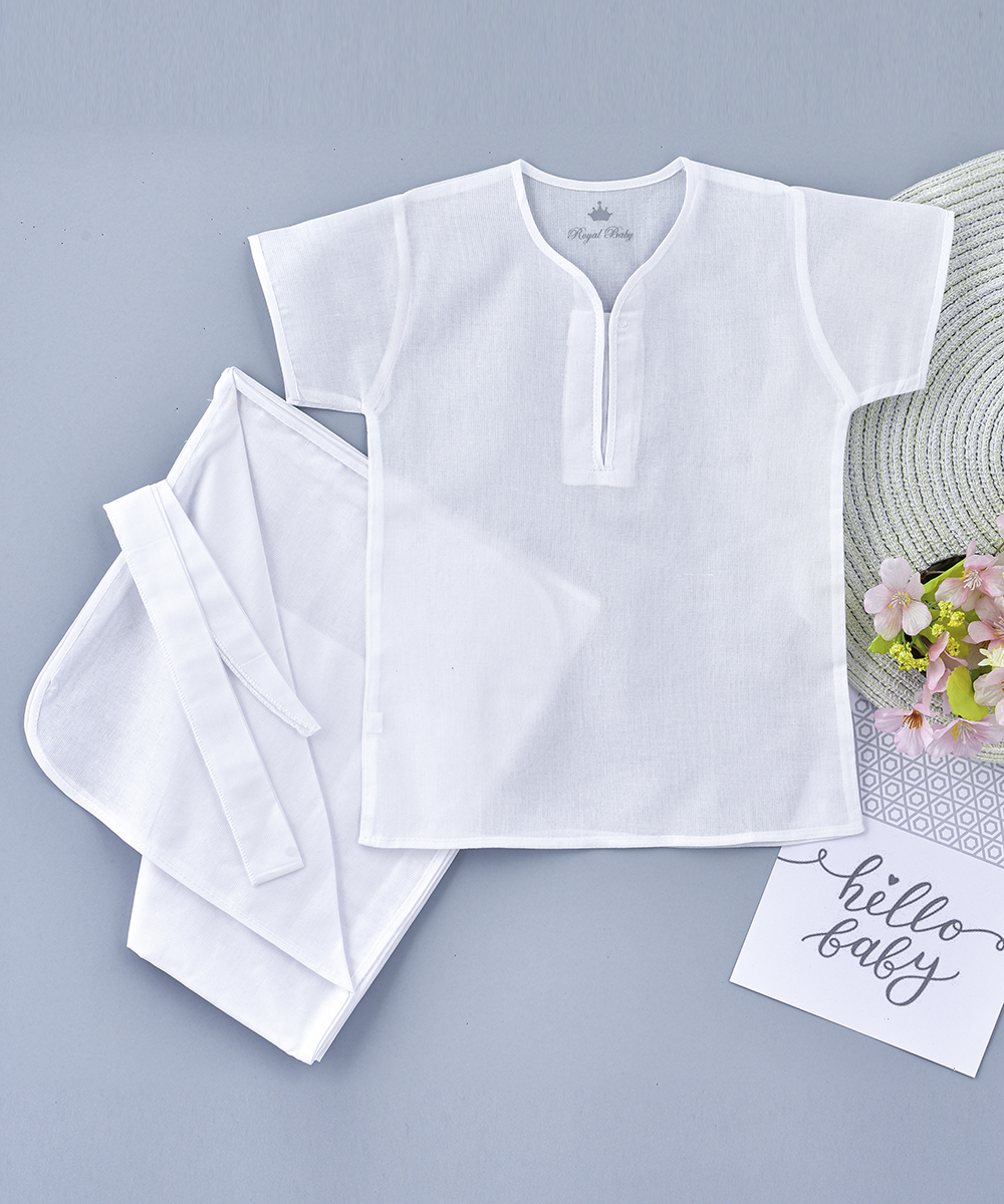 ROYAL BABY’S 3 piece jalabiya wrapper and belt.Are made up of 100 % swiss cotton soft and thin fabric , breathable versatile and pre washed cloth. Finished with full white piping design .Ensures baby’s ultimate comfort at bed time and beyond.