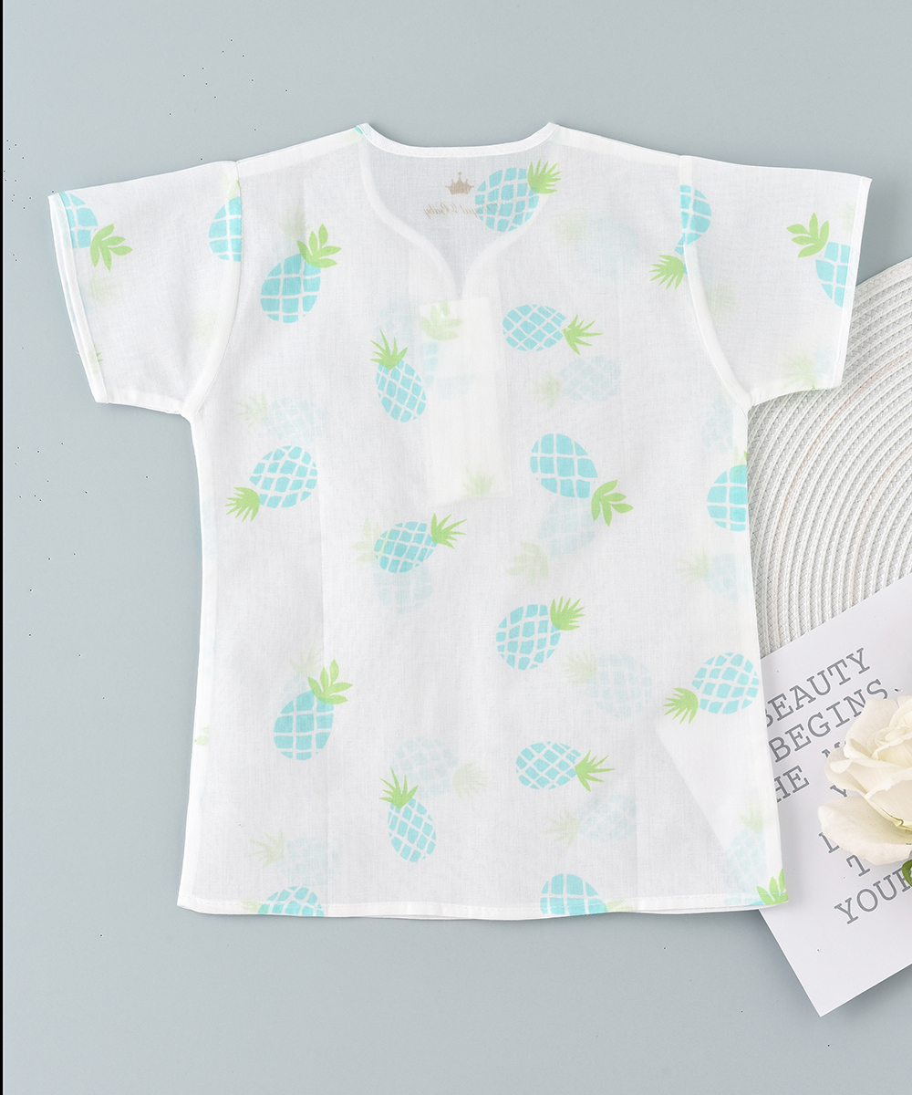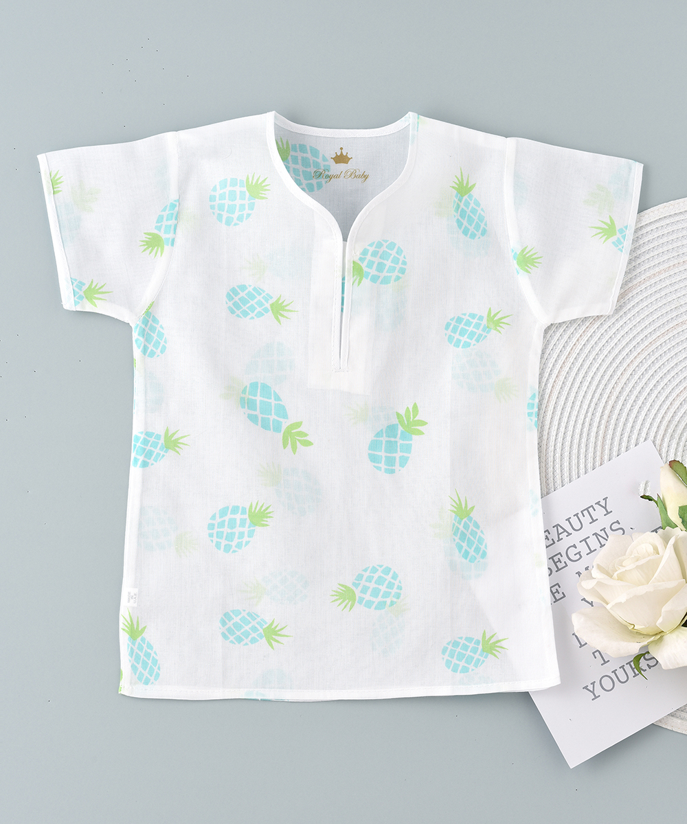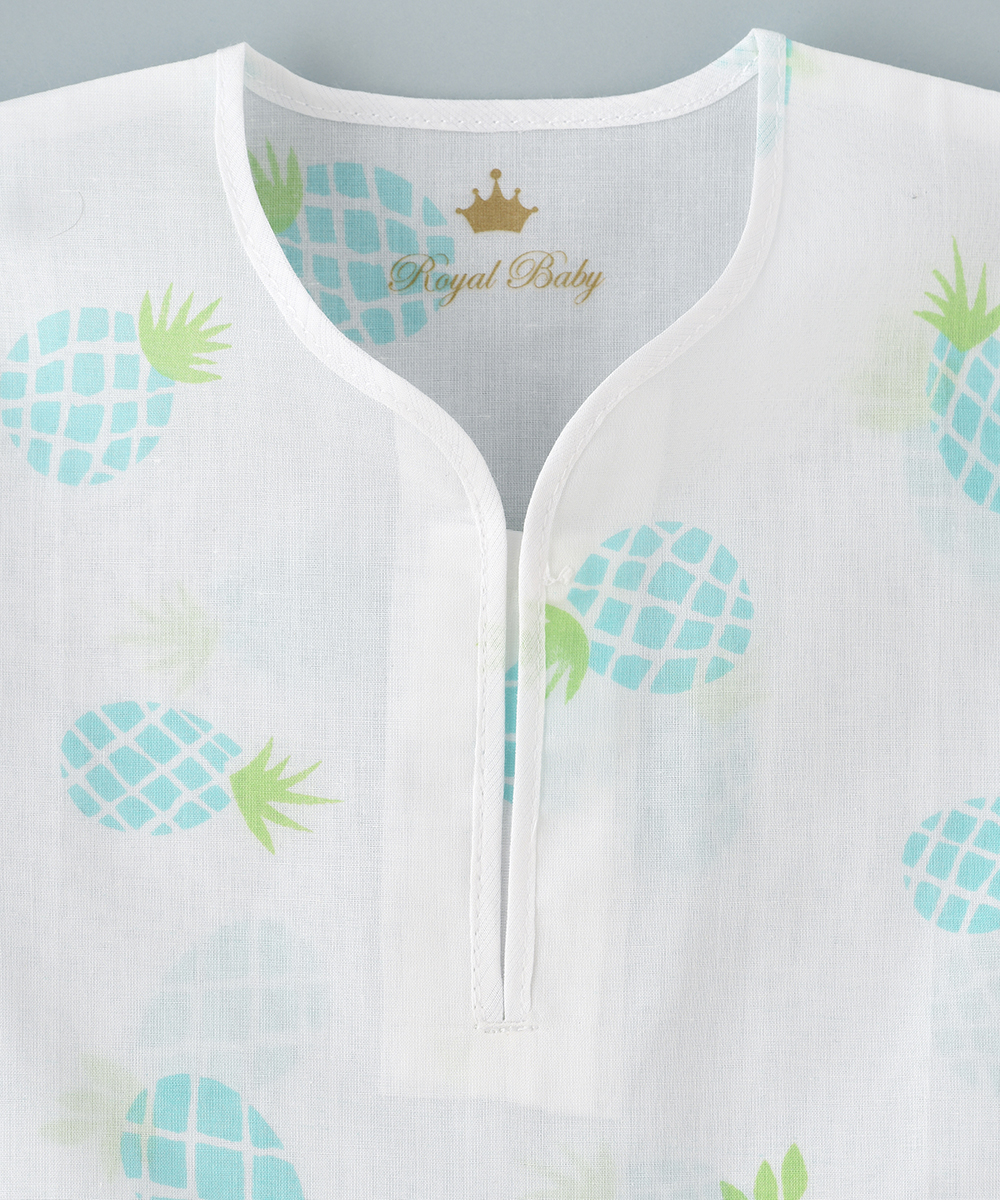 ROYAL  BABY ‘S  jalabiya a new  cotton rich fabric for babies. These are made up of 100% cambric print cotton  soft , thin and breathable high quality fabrics. Printed with beautiful pineapples design. ensures babies ultimate comfort  for everyday use