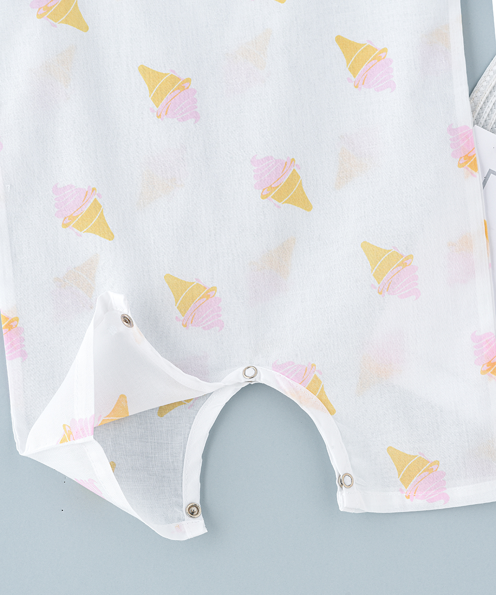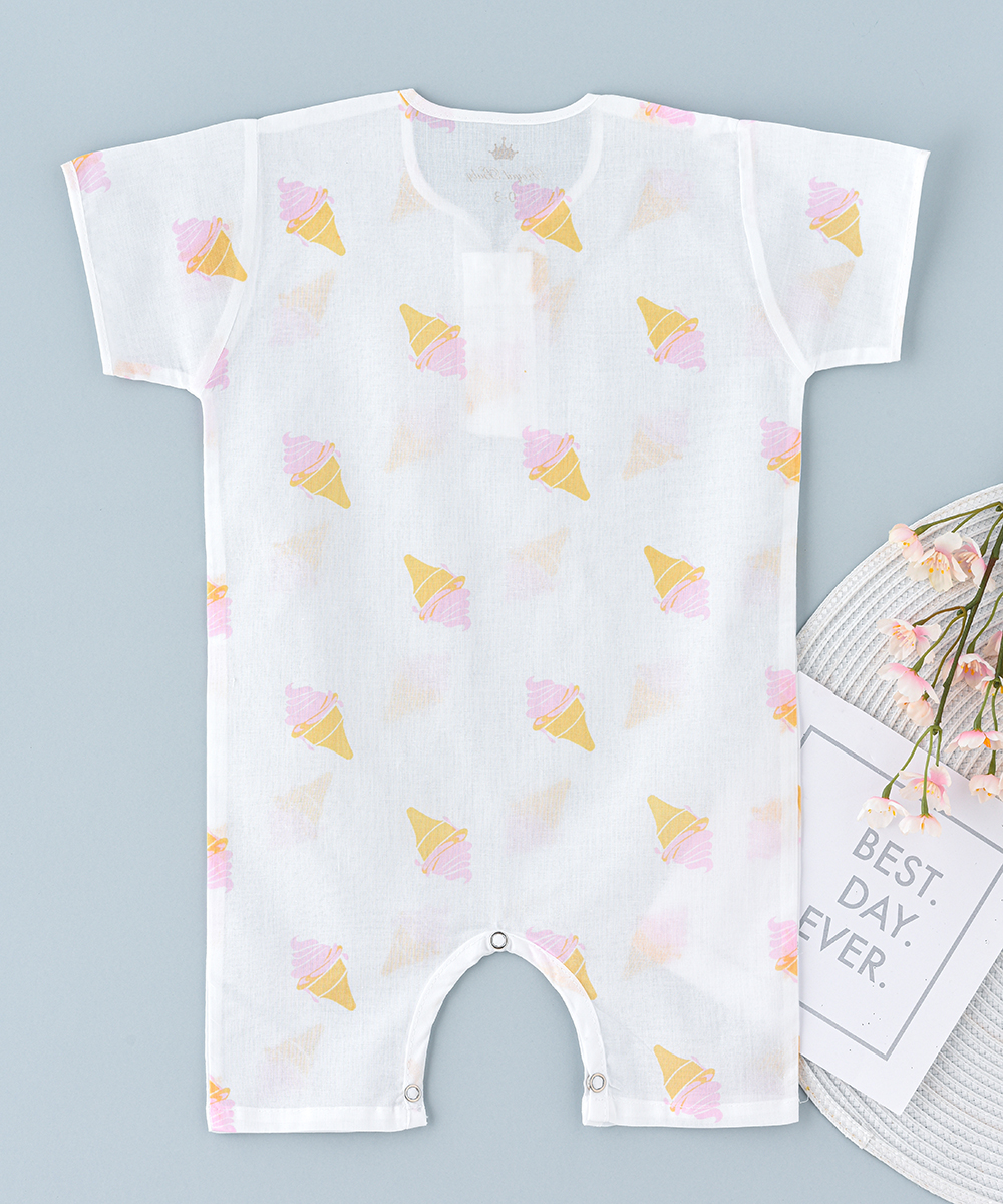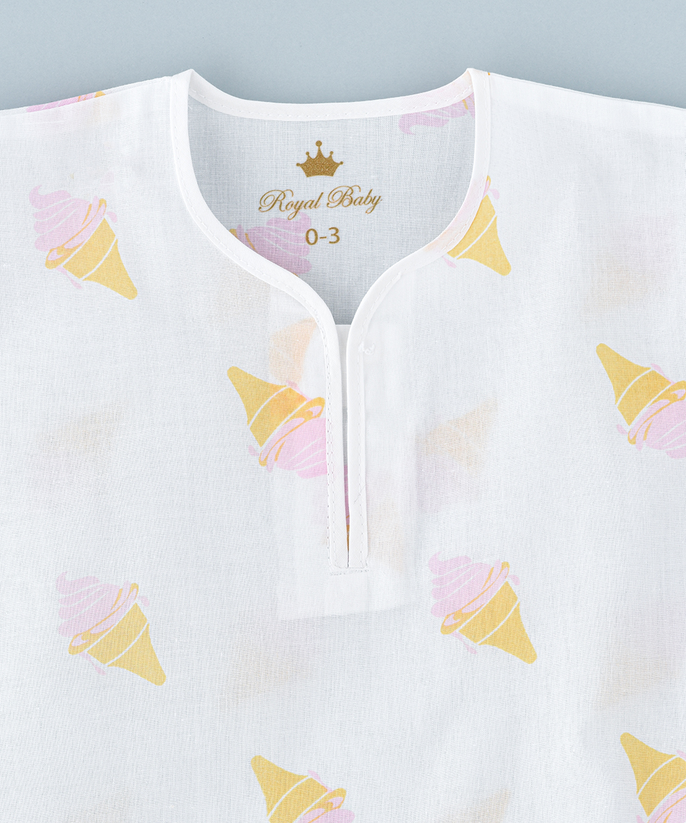 ROYAL BABY ‘ S rompers are made up of 100 % cambric printed  cotton soft and thin cloth breathable versatile and pre washed cloth. Printed with beautiful ice cream design. Ensures baby’s ultimate comfort at bed time and beyond