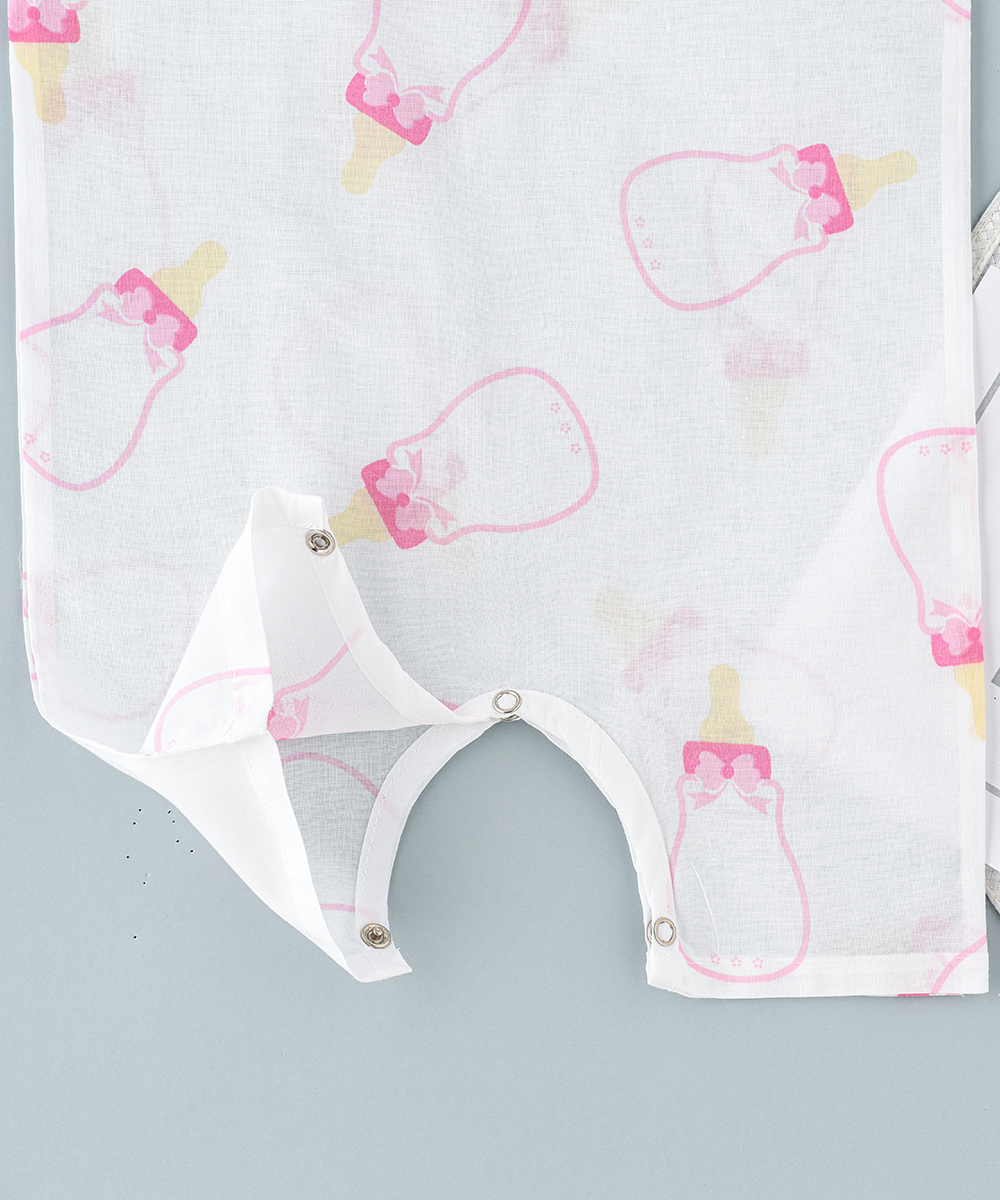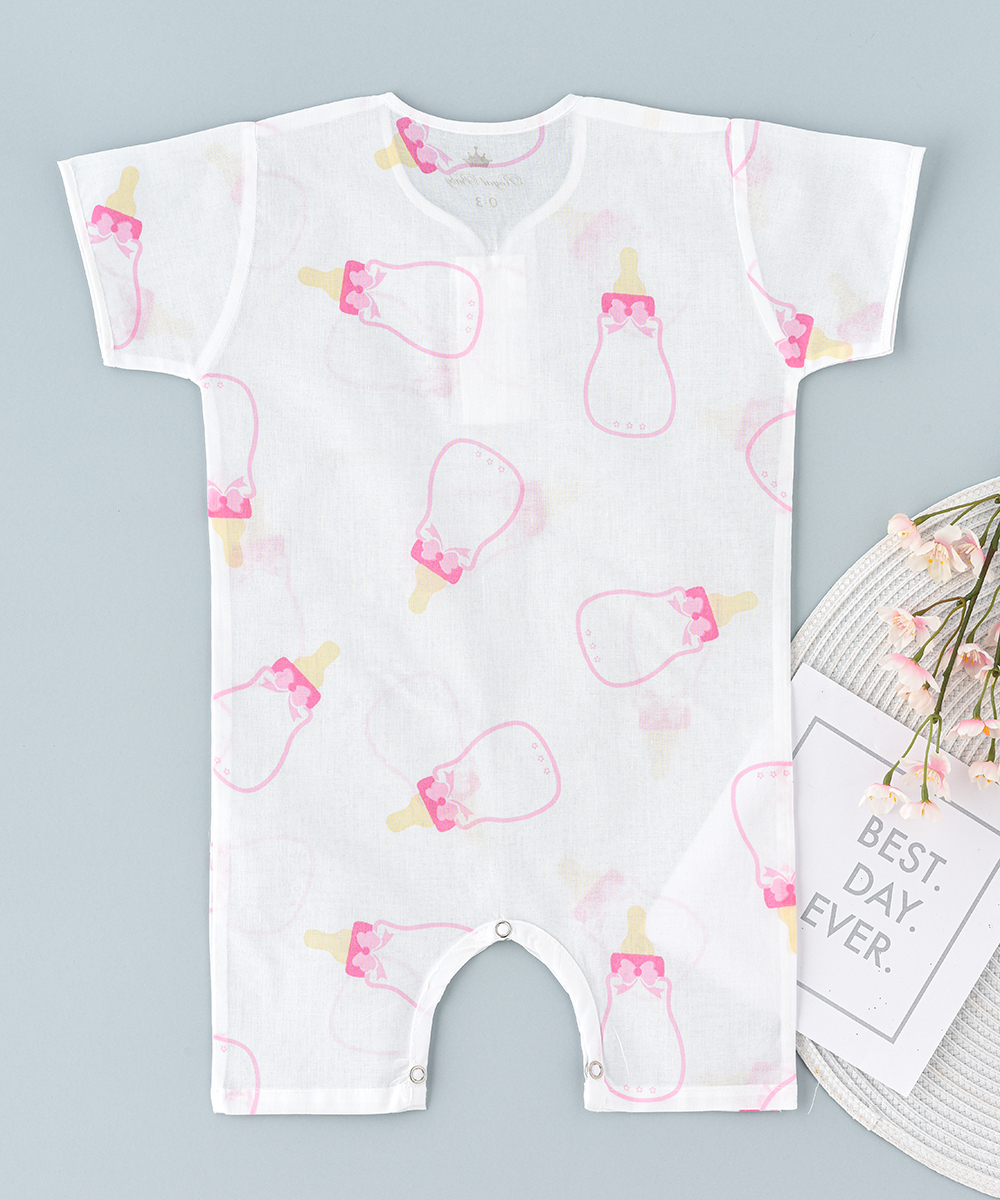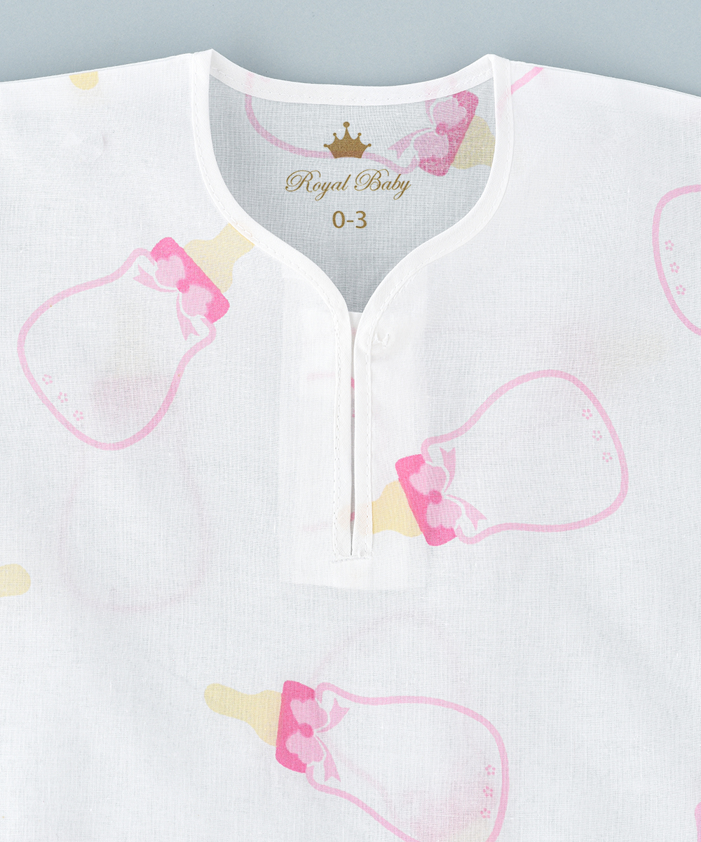 ROYAL BABY ‘ S rompers are made up of 100 % cambric printed cotton soft and thin cloth breathable versatile and pre washed cloth. Printed with beautiful feeding bottle design. Ensures baby’s ultimate comfort at bed time and beyond